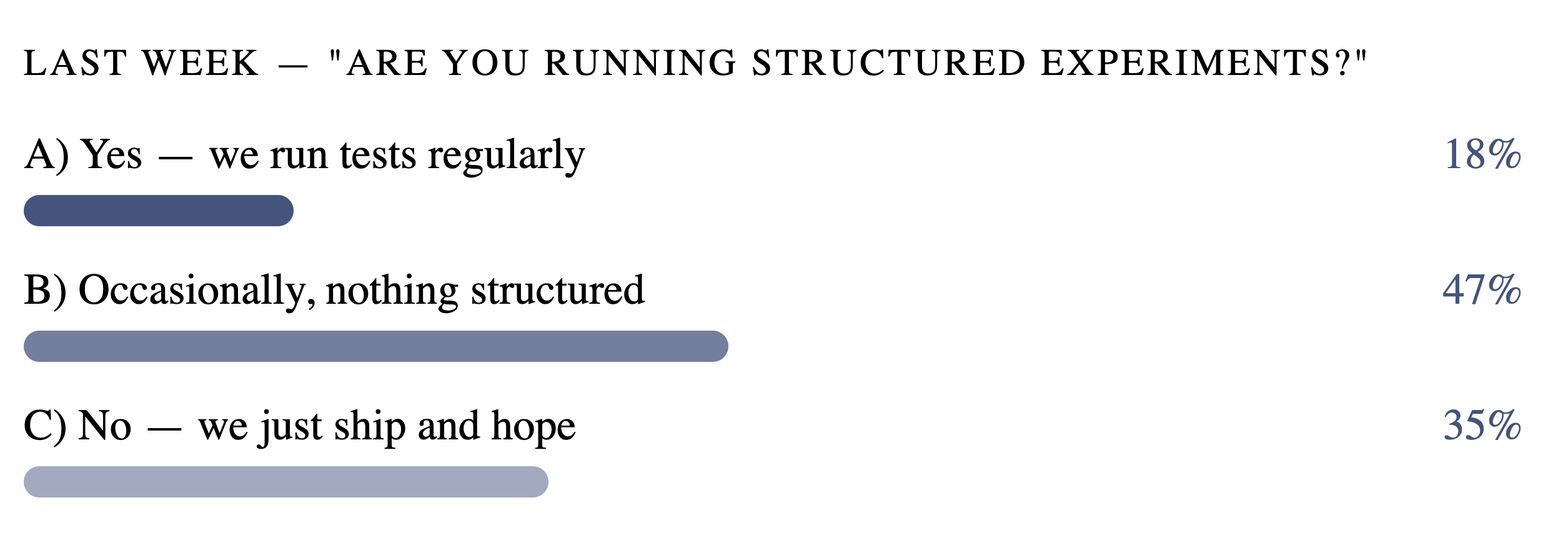 82% of you are either testing occasionally or not at all. With Rollouts now native to Shopify admin, that gap just got a lot easier to close. More on that in the updates above.